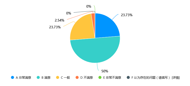 大部分受访者对所在城市的生活满意度表示满意(选择“非常满意”和“满意”),其中“满意”选项占比最高,达到了50%。仅有2.54%的受访者表示不满意,且没有人选择“非常不满意”或认为存在问题。从结果可以看出受访者对城市生活的满意度较高。