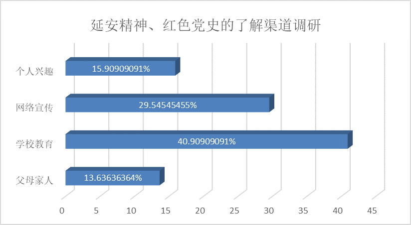 调研结果显示,多数参与者对延安精神和红色党史有一定了解,但整体认知深度不足,尤其在内涵理解和相关历史事件方面存在欠缺。在了解延安精神的渠道方面,40.91%的同学主要通过学校教育获取相关信息,网络宣传则以29.55%的占比位居其次。