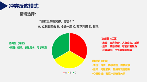 之后,蒋棹骏同学介绍了面对冲突的三种常见的应对方式:攻击型(红区),如选择立刻怼回去,表现为大声争吵、人身攻击等,虽看似强势,实则是用外在的强硬掩盖内心脆弱,后果往往是关系破裂,甚至引发暴力;回避型(黄区),像冷战一周,还包括转移话题、假装没事等做法,其源于害怕冲突破坏关系的心理,但问题会不断累积,最终更剧烈地爆发;协商型(绿区),即私下沟通,强调倾听、表达需求并寻求双赢,是积极健康的冲突处理方式。