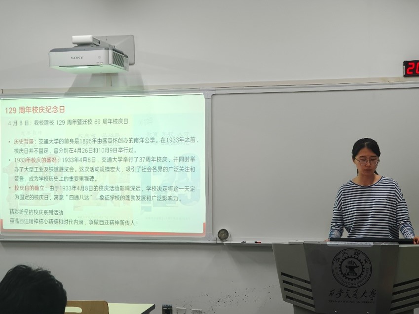 建校129周年暨迁校69周年之际。高婉婧带领支部成员回顾西安交大129年的光辉历程。从1896年南洋公学的创立,到1956年响应国家号召西迁扎根,再到新时代依托中国西部科技创新港建设教育科技人才一体改革示范区,交大始终与民族复兴同频共振。通过视频展播与图文讲解,同学们深刻体会到“精勤求学、敦笃励志、果毅力行、忠恕任事”校训的深刻内涵。