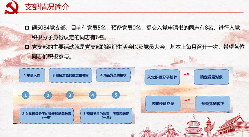 会议第一部分,彭百胜同志向支部成员介绍本支部的基本情况,并为党员同志发放党员政治生日贺卡以及党员徽章,激励党员同志们继续努力,发挥好党员的模范带头作用,还介绍了入党的基本流程以及本党支部的量化考核方案。