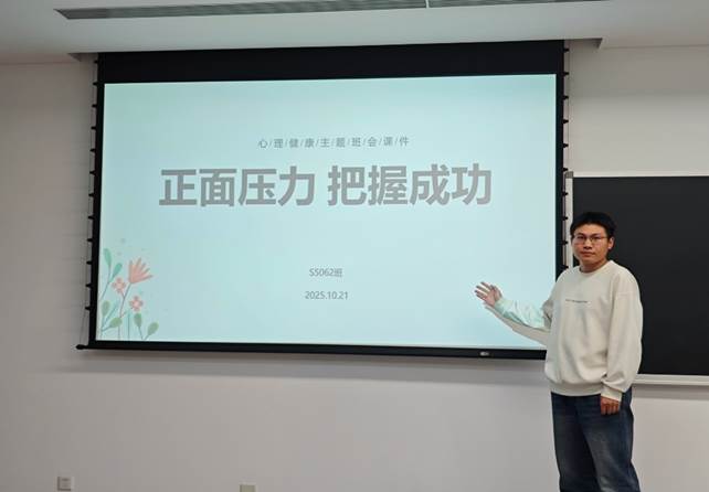 创新港校区1-4056教室举行了以“正面压力,把握成功”为主题的心理健康班会。为帮助同学们科学认知压力、有效管理压力,以积极心态应对学习科研与生活中的各类挑战,班会围绕压力的认知、来源、测试及缓解方法等核心内容展开,为全班同学送上了一场实用且暖心的心理赋能盛宴,会议由心理委员李新宇主持。