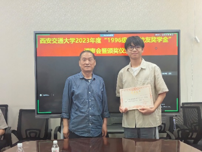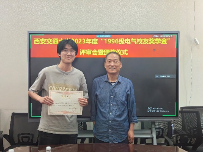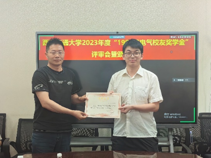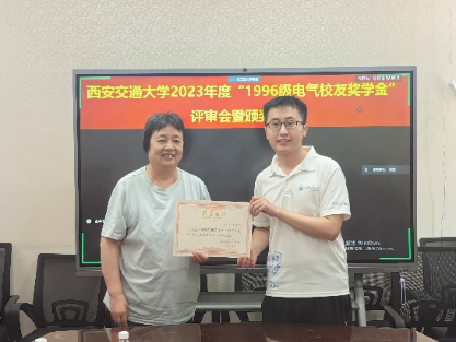 2024年5月13日,电气学院召开“1996级电气校友奖学金”评审会暨颁奖仪式,评审委员会主席张彦斌教授、委员刘崇新教授、王仲奕教授、96级电气校友粟俊(西安艾飞能源数字技术有限公司)、96级电气校友曹卫国(南京五采智电电力科技有限公司)、96级电气校友左广巍(武汉致卓测控科技有限公司),96级电气校友邹加勇(中兴通讯西安研究所),“1996级电气校友奖学金”管理委员会副主任陈玉老师出席会议。评审委员会根据申请人学习情况,创新能力,综合素质,社会实践表现综合评定,最终评选出电测、发电、电机、绝缘、电器、三电、工企、高压方向各1名,共计8名三年级本科生,授予2023年度“1996级电气校友奖学金”。