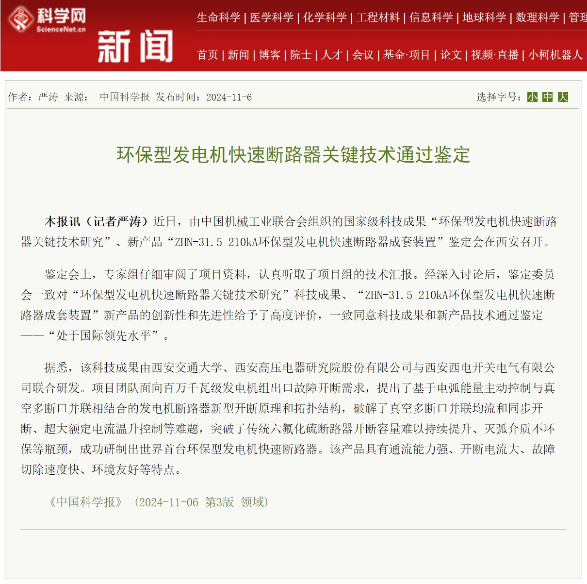 本报讯(记者严涛)近日,由中国机械工业联合会组织的国家级科技成果“环保型发电机快速断路器关键技术研究”、新产品“ZHN-31.5 210kA环保型发电机快速断路器成套装置”鉴定会在西安召开。